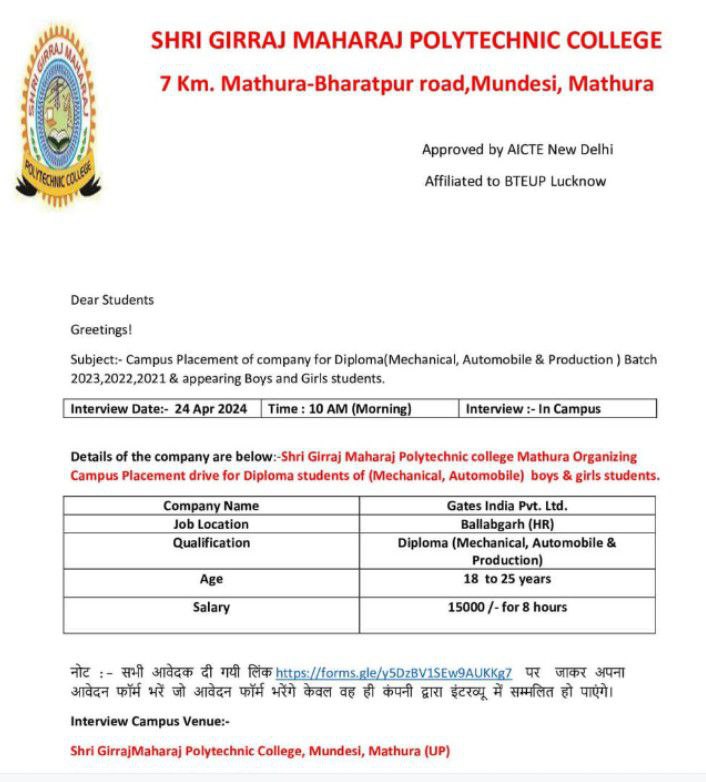 Campus Venue: Shri Girraj Maharaj Polytechnic Collage, Mundesi, Mathura (Uttar Pradesh)